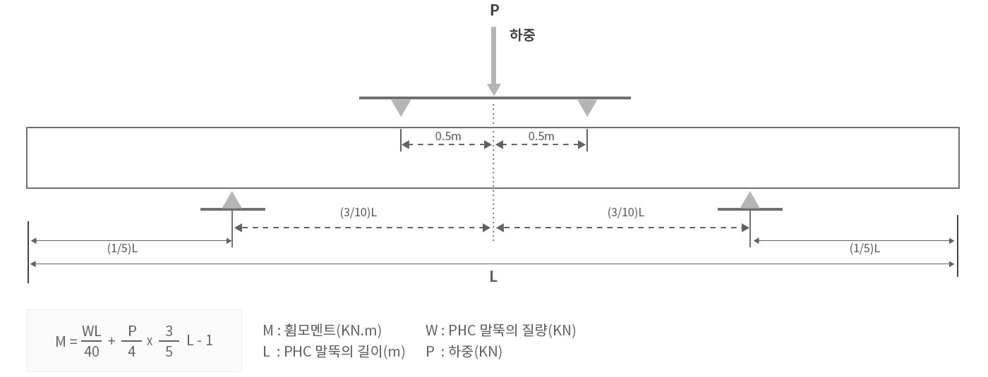 PHC 말뚝 길이의 3/5을 지간으로 하여 지지하고 지간의 중앙에 연직하중 P를 가하여 휨 모멘을 산출합니다.